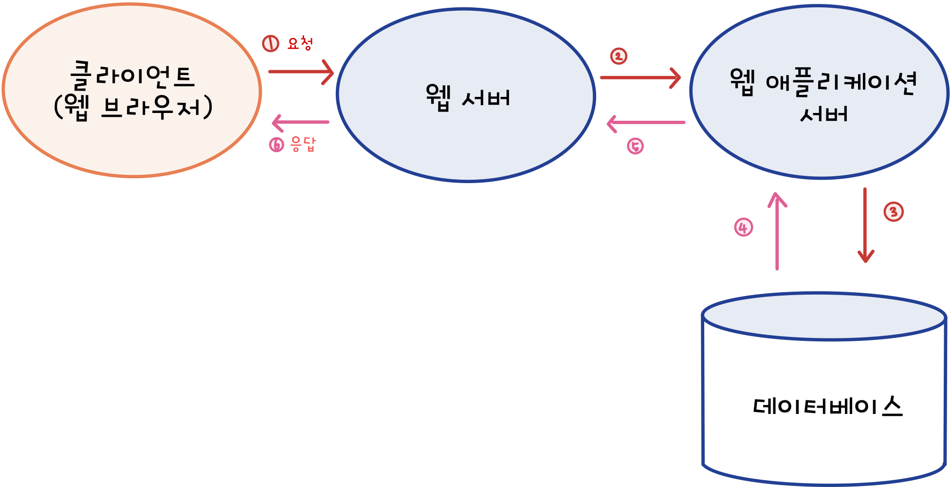 클라이언트 요청 -> 웹 서버 -> 웹 컨테이너 (서블릿 활성화) 응답 -> 웹 서버 -> 클라이언트