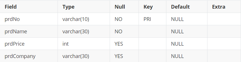 prdNo VARCHAR(10) NOT NULL PRIMARY KEY,