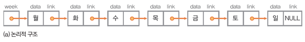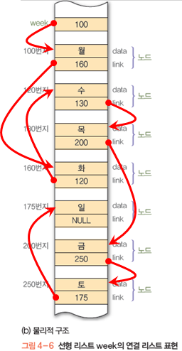 - 리스트 각 항목은 기억 장소의 순서대로 위치하지 않고 링크라는 필드를 이용하여 리스트 원소들의 순서를 나타냄