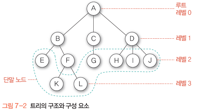 - 노드(node): 트리를 구성하는 각 자료 항목: A, B, C, D, E, F, ...