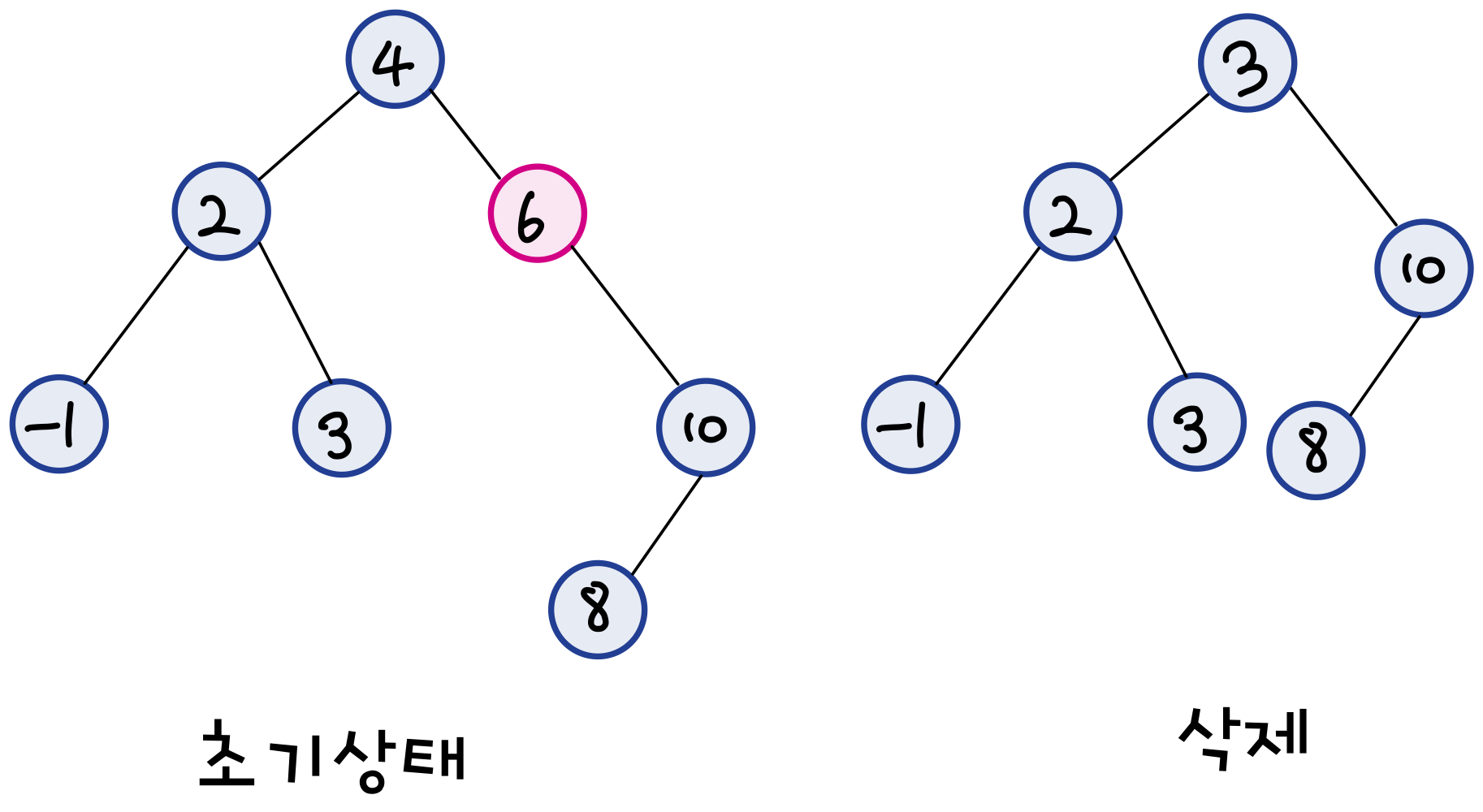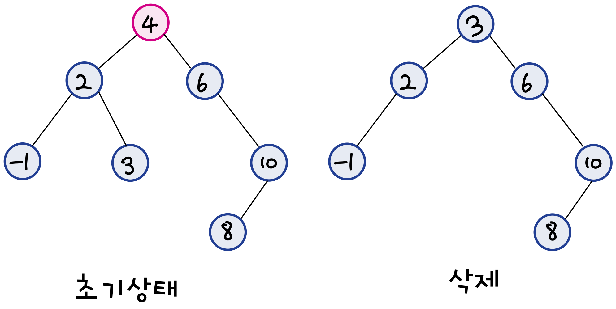 삭제되는 노드의 좌측 트리 중 제일 오른쪽 단말 노드로 대체