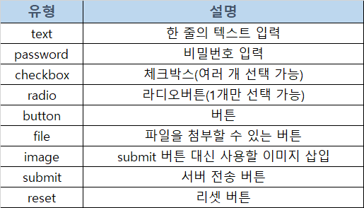 <input> 태그의 type 속성에서 사용 가능한 유형