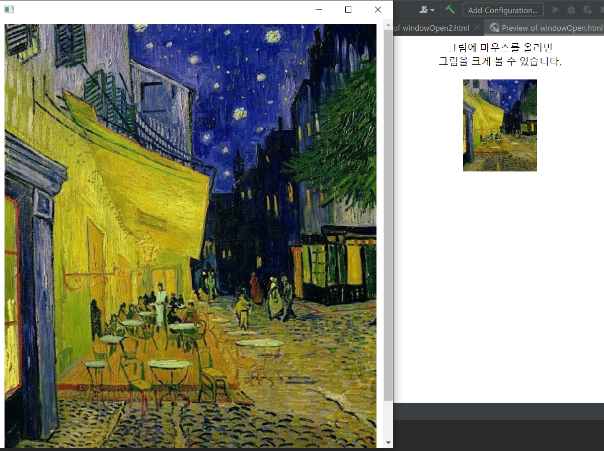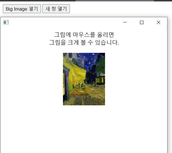 windowOpen을 실행시키고, 그림 위에 마우스를 올리게 되면 bigImage 파일이 열리면서 큰 이미지를 볼 수 있다.