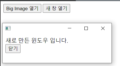 // 새로운 창에 문자열과 버튼 출력 / 버튼 클릭 시 창 닫는 기능 포함